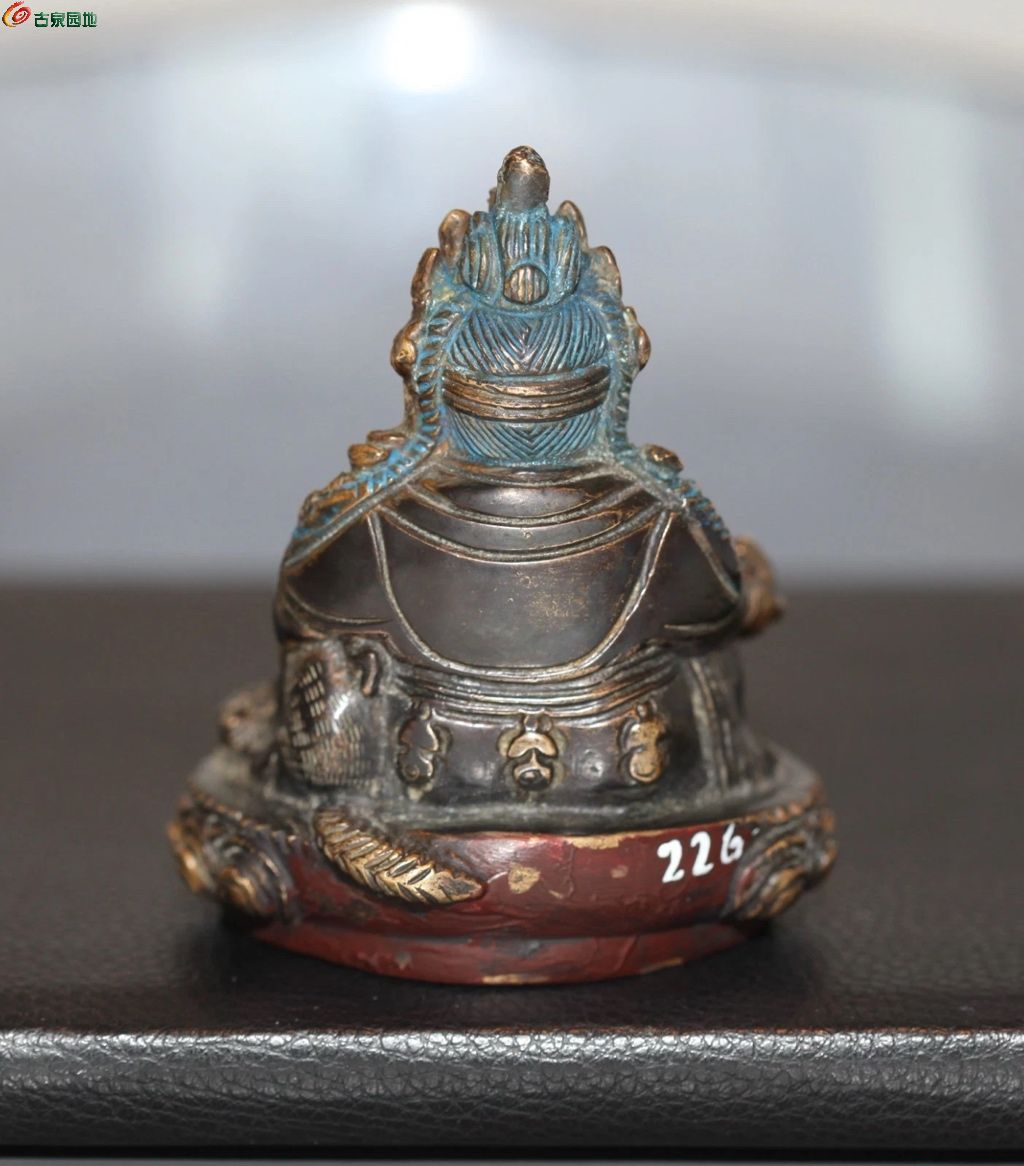 铜质不老显火气,包浆单一浮浅不自然,表面所涂颜料皆为现代化学颜料,纹饰铸造粗糙,开脸也不自然,封底工艺不对,整体无自然供奉磨损痕迹。