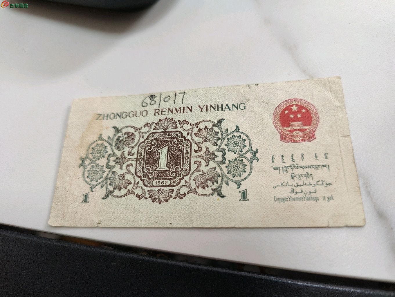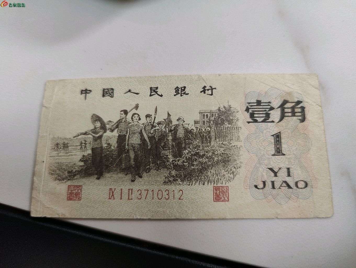 仿第三版人民币背绿一角券。主景层次感差,人物略模糊,冠号以及流水线的号码体不符。整体包浆人为磨损做旧;鉴定结果:伪品。