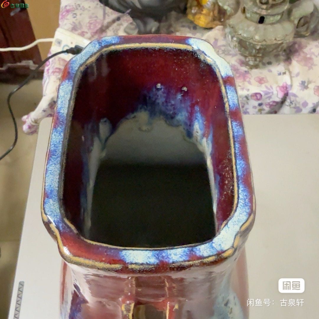 仿古窑变釉贯耳尊,器型胎釉工艺不符,底部人为做旧明显。
